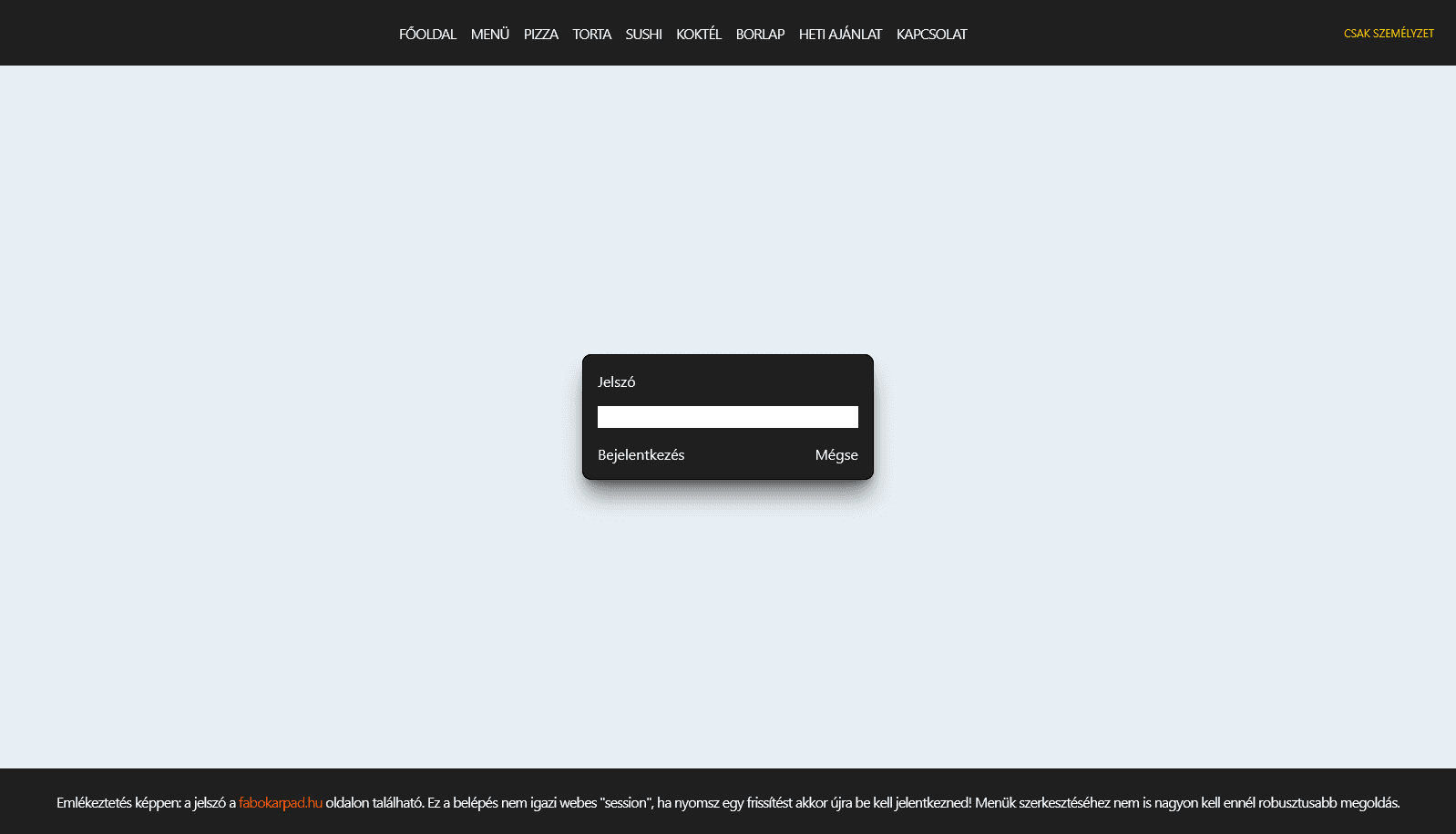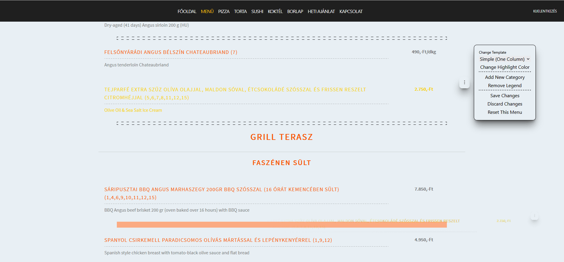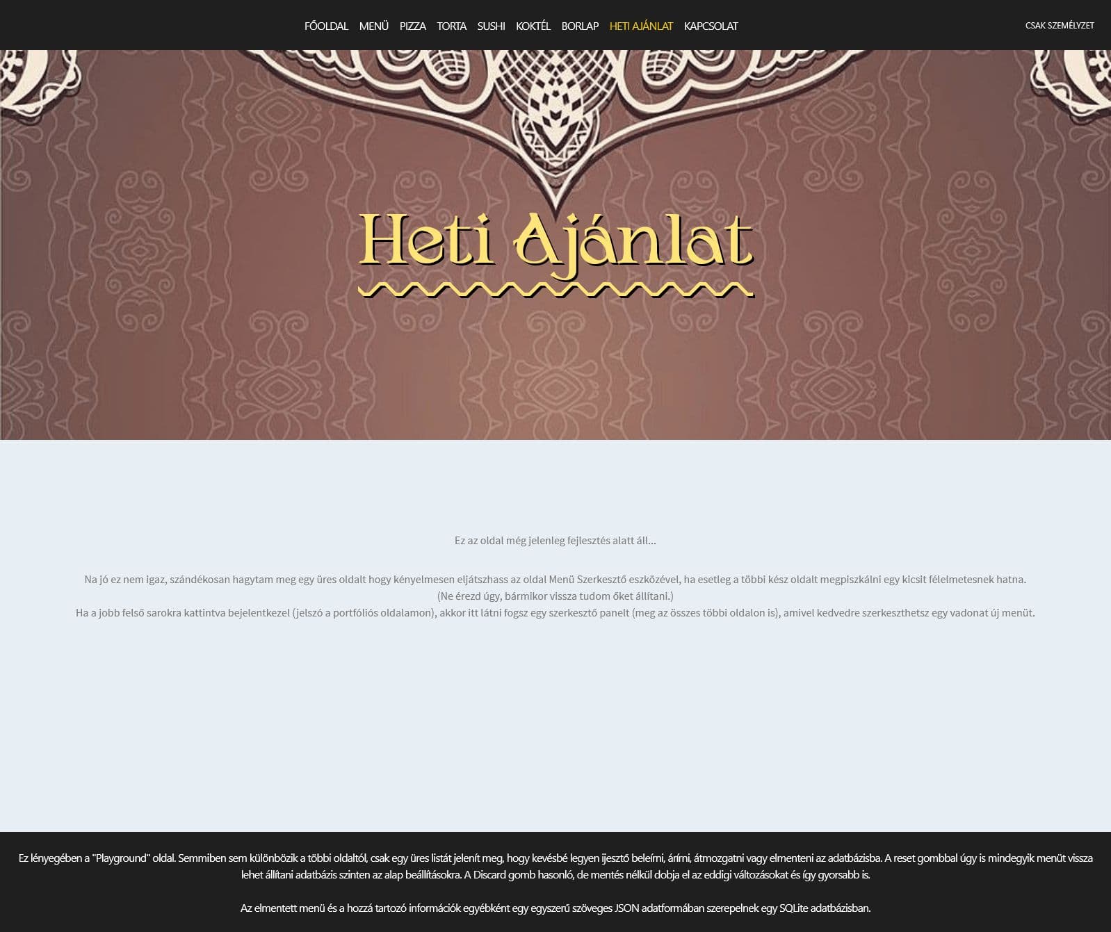 Az alkalmazás Nuxt.js 4-et használ, az adatbázis ami tárolja a menüket pedig egy sima SQLite fájl ami szöveges JSON adatként tartja nyílván az állapotokat, ugyanis semmiféle keresésre vagy relációs információra nincs szüksége az oldalnak, egyszerűen kiolvasunk mindent vagy beírunk mindent egy műveletben. Ez a SQLite adatbázis a Turso platformon él.