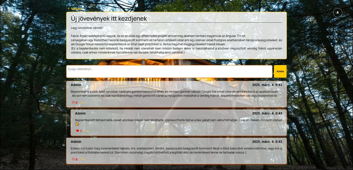 Egy Angular 19+-ban írt közösségi fórum oldal ami egy Reddithez hasonló beágyazott komment struktúrát használ, ami lehetővé teszi hogy a felhasználók megjegyzéseket hagyjanak egymás posztjai alatt vagy a posztok alatti egyes kommentekre. Ezeket a posztokat „járásokba”, vagyis kategóriákba szervezve jeleníti meg a főoldal. Minden felhasználó írhat saját kommenteket akár az eredeti posztra vagy más felhasználók válaszaira, lájkolhatják mások kommentjeit vagy létrehozhatnak új posztokat a főoldalon, a posztjaikhoz pedig csatolhatnak maximum 9 kép csatolmányt. (És jelen pillanatban a személyes blog bejegyzéseimet is néha ide töltöm fel, ha akad valami megosztásra méltó.) Mindezt akár bejelentkezés nélkül is megtehetik, ugyanis az oldal felkeresésekor alapvetően mindenki egy megosztott „vendég” fiókba van bejelentkezve és minden alap funkció mindenkinek egyformán elérhető, csak ezzel együtt bárki könnyedén felülírhatja amit egy másik vendég csinált. Bejelentkezett felhasználók írásait azonban csak ők maguk változtathatják meg és a lájkjaikat is csak ők vonhatják vissza. Bejelentkezni Google-os email címmel lehet a jobb felső lebegő gombra kattintva. (Aki bejelentkezik az bekerül az app adatbázisába.)