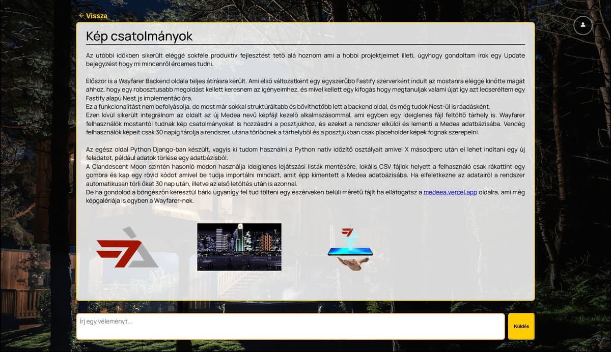 A kép csatolmányok kezeléséért egy saját Medea nevű projekt a felelős, ami API hívásokon keresztül kommunikál a Wayfarer backend oldalával és a felhasználó által feltöltött képeket egy saját adatbázisban tartja nyílván. (Egész pontosan a workflow úgy néz ki, hogy a Wayfarer frontend oldala feltölti a csatolmányokat a Vercel Blob adattárházba ami pont az ilyen nem-szöveg alapú adatfájlokra specializálódott, majd szól a Medea-nak hogy másolja fel azokat az ImageKit.io médiakezelő platformra és tartsa számon őket egy saját Postgres adatbázisban, majd az megküldi a feltöltött képek URL-jét a Wayfarer-nek. Vendég felhasználók csatolmányait 30 nap után törli a rendszer, a Medea szól a Wayfarer szerverének és a posztokban csak egy placeholder kép fog megjelenni.)